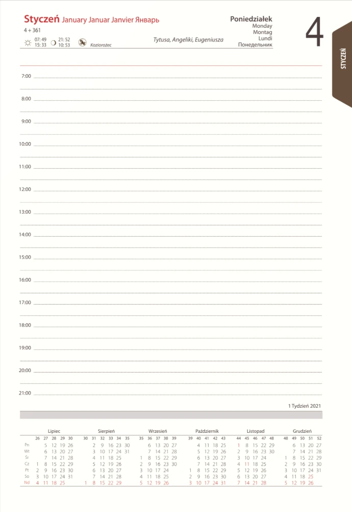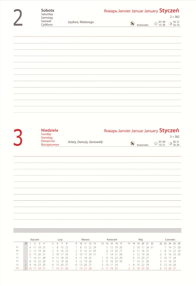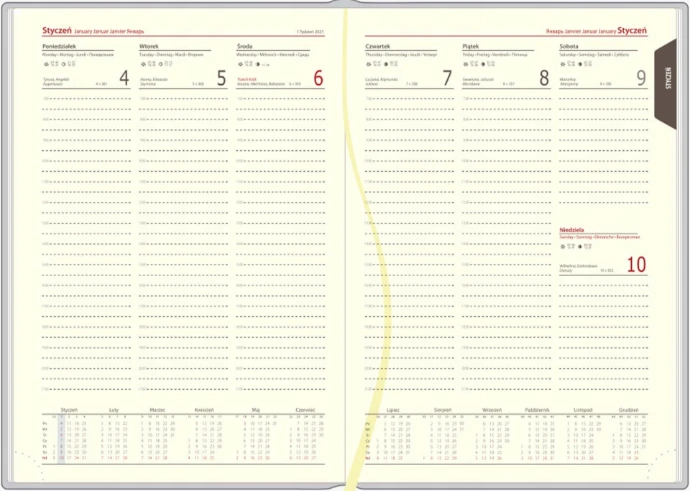 - Układ: dniowy, 1 dzień na 1 stronie, przed każdym miesiącem terminarz miesięczny